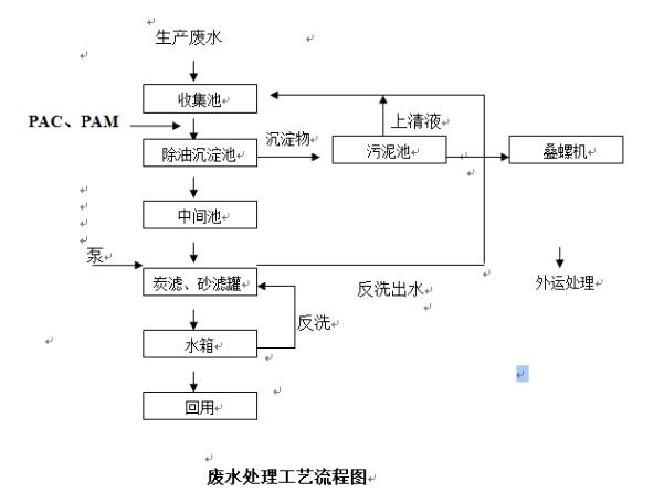 生产废水排至收集池收集,通过提升泵按一定流量进入隔油沉淀池,在反应区一方面通过加入PAC、PAM去除废水中的SS,另一方面隔离废水中的油类。反应后进入沉淀区,进行固液分离,上清液通过提升泵进入炭滤、砂滤罐,沉淀的杂质排入污泥池。